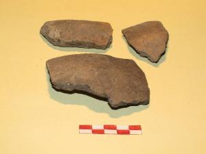 5 frammenti di orlo e parete pertienti a scodellone prodotto in ceramica di impasto grossolana, avente orlo piatto indistinto. Presenta larghe e grossolane solcature sulla parete.