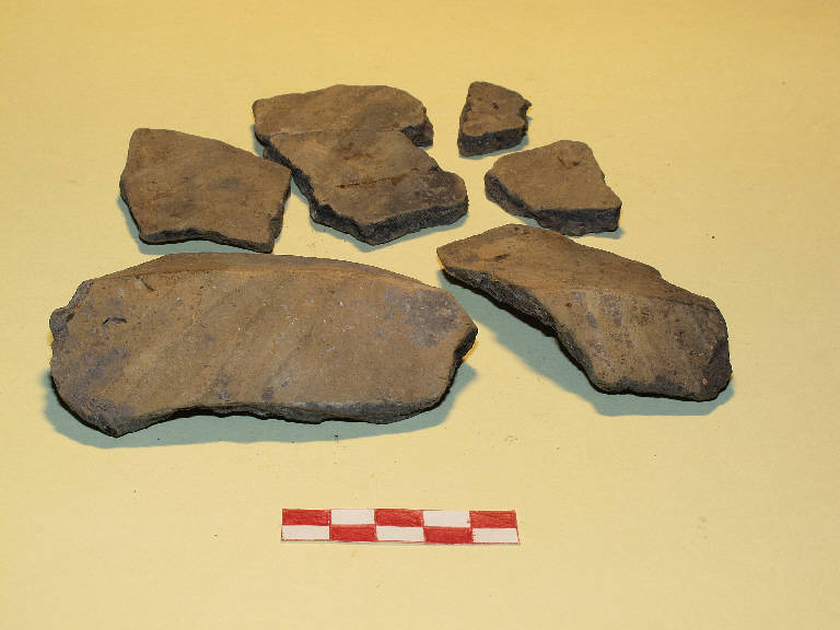 8 frammenti di pareti pertienti a capeduncola prodotta in ceramica di impasto depuarata. Presenta fasci di solcature sulla vasca.