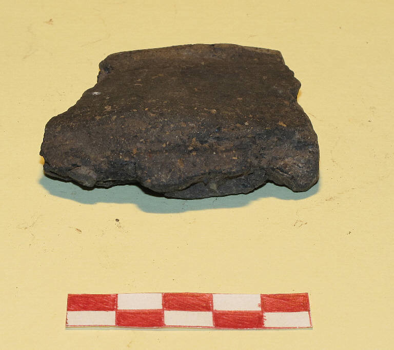 Frammento di orlo esoverso e parete pertienti a tazza carenata, prodotta in ceramica di impasto mediamente depuarata. Presenta delle solcature sulla parete.