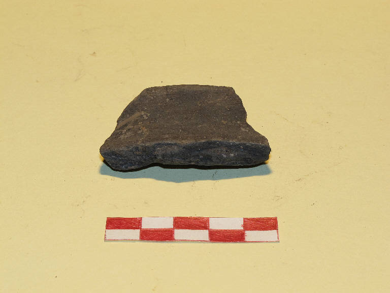 Frammento di orlo e parete pertiente a tazza carenata con labbro esoverso, prodotta in ceramica di impasto mediamente depuarata. presenta delle solcature sulla parete.