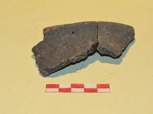 8 Frammenti di orlo esoverso e parete pertienti a tazza carenata, prodotta in ceramica di impasto mediamente depuarata. Presenta fasci di solcature ad angolo.