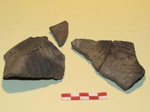 4 Frammenti pertienti a scodellone, prodotto in ceramica di impasto mediamente depurata, avente orlo assottigliato, labbro esoverso. La vasca presenta fasci angolari di solcature con coppelle.