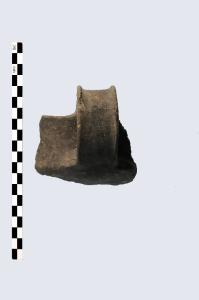 Frammento di parete con ansa a sopraelevazione a nastro con i margini leggermente sopraelevati, con sezione circolare, pertinente a tazza carenata con parete a gola più o meno evidenti nella parte superiore, prodotta in ceramica d'impasto grossolana, color grigio e superfici lisciate. Orlo arrotondato ed esoverso.