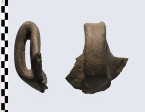 Ansa con sopraelevazione a bastoncello e sezione poligonale, pertinente a tazza a calotta, prodotta in ceramica d'impasto medio-fine, color grigio-bruno e superfici lisciate.