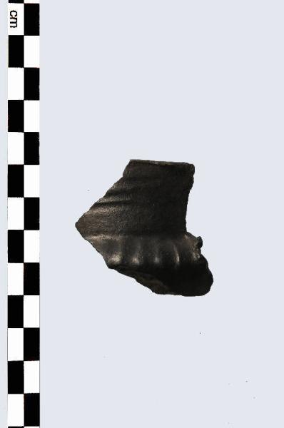 Frammento di orlo e parete, pertinente a scodella carenata, prodotta in ceramica d'impasto fine, color grigio scuro, superficie lisciata, avente collo verticale a profilo rettilineo e corpo globoso. Presenta una decorazione costituita da 3 solcature orizzontali sotto l'orlo e solcature verticali in serie continua sulla spalla.