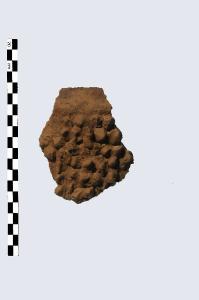 Frammento di orlo e parete, pertinente a vaso tronco-conico, prodotto in ceramica d'impasto grossolano, color grigiastro.Presenta una decorazione costituita da 1 cordone poco sotto l'orlo anch'esso decorato da tacche e bugne su tutto il corpo disposte irregolarmente.