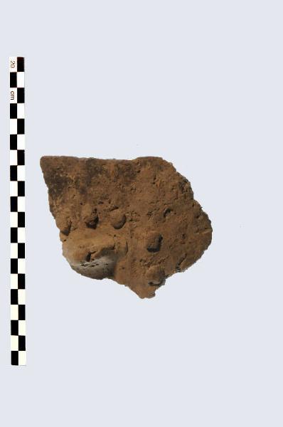 Frammento di orlo e parete, pertinente a vaso tronco-conico, prodotto in ceramica d'impasto grossolano, color bruno chiaro e superfici lisciate. Orlo decorato a tacche. Presenta una decorazione plastica costituita da bugne disposte in modo circolare attorno all'ansa, di tipo a presa forata.