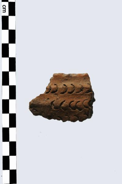 Frammento di orlo e parete, pertinente a vaso, prodotto in ceramica d'impasto grossolano, color grigio, avente orlo appiattito e parete appena arrotondata. Presenta una decorazione costituita da 2 file di impressioni semicircolari.