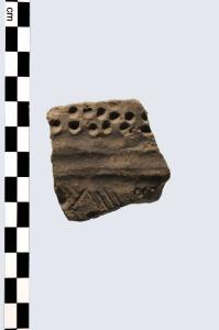 Frammento di parete, pertinente a vaso, prodotto in ceramica d'impasto grossolano, color grigio, e superfici lisciate. Presenta una decorazione costituita da file di coppeline impresse abbinata a una decorazione costutuita da solcature lineari oblique.