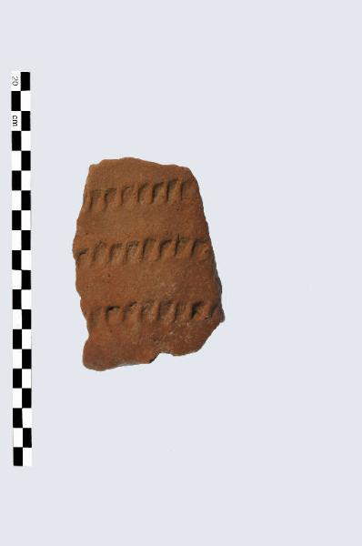 Frammento di parete, pertinente a vaso, prodotto in ceramica d'impasto grossolano, color rossiccio. Presenta una decorazione costituita da 3 file di tacche parallele.