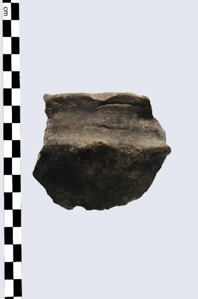 Frammento di orlo e parete, pertinente a tazzina careanta, prodotta in ceramica d'impasto grossolano, color bruno-grigio, avente orlo arrotondato, esoverso e parete concava nella parte inferiore e leggermente rientrante nella parte superiore. Presenta una bugna poco preminente all'altezza della carenatura.