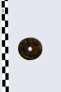 Manufatto, prodotto in osso, di tipoB, avente faccia leggermente convessa a profilo circolare, foro passante centrale e breve peduncolo cilindrico. Superficie levigata.