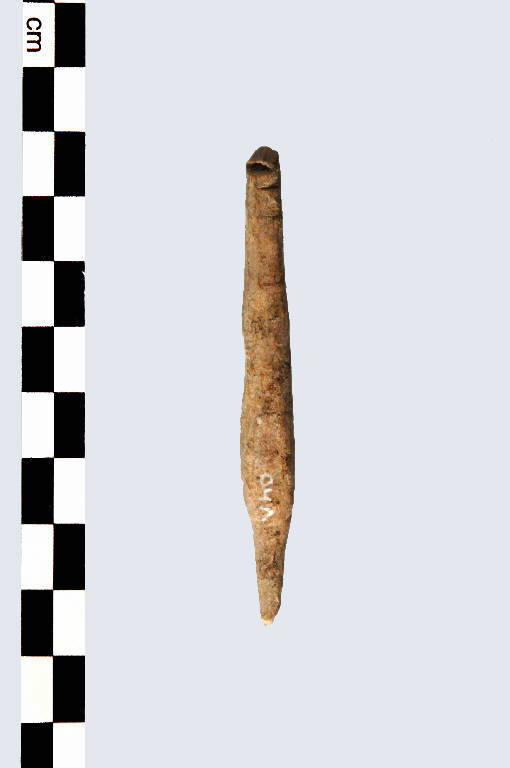 Punta di freccia fusiforme, di tipo G, a sezione pseudo-circolare. La punta si trasforma senza transizione in peduncolo.