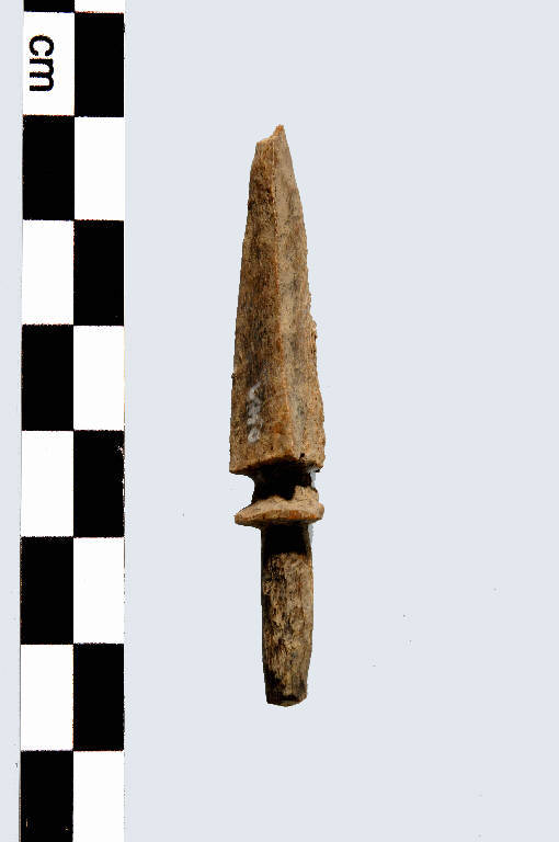 Punta di freccia fusiforme, di tipo J, a sezione triangolare, con collarino ben definito tra punta e peduncolo. Il manufatto si trova in corso di lavorazione.