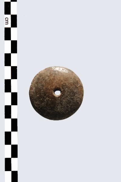 Manufatto, prodotto in osso, di tipo B, avente faccia superiore leggeremente convessa a profilo circolare, foro passante centrale e peduncolo cilindrico breve e frammentario. Superficie levigata.