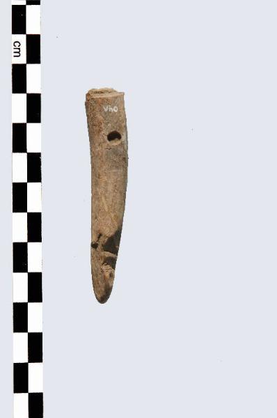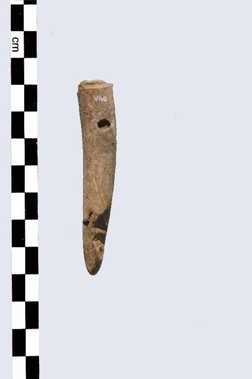 Immanicatura di acciarino, in corso di lavorazione, con due fori non ancora del tutto aperti, simmetrici in prossimità della base. Si notano tracce di taglio in corrispondenza del punto in cui dovava essere il foro per l'innesto dell'acciarino.