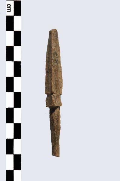 Punta di freccia fusiforme, di tipo J, a sezione triangolare, con collarino ben definito tra punta e peduncolo.