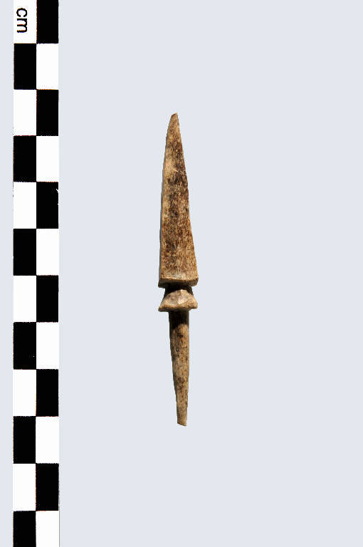 Punta di freccia fusiforme, a sezione circolare, con collarino ben definito tra punta e peduncolo fusiforme terminante a punta.