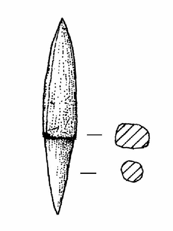 Punta tronco-piramidale a sezione quadrangolare. Passaggio tra punta e peduncolo non ben evidenziato. Peduncolo a sezione circolare con estremità appuntita.