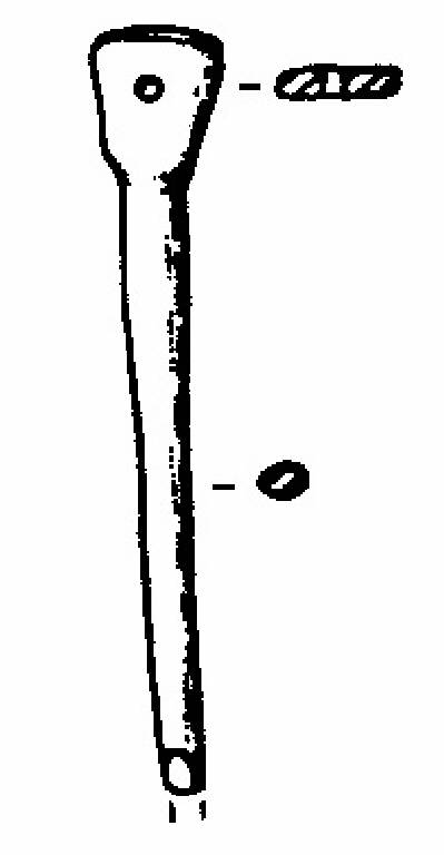 "Spillone" con capocchia quadrangolare e foro passante circolare di tipo cilindrico. Gambo con andamento rettilineo a sezione circolare.