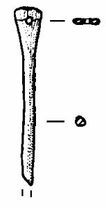 "Spillone" a capocchia triangolare e foro passante circolare del tipo imbutiforme. Gambo diritto a sezione sub-circolare.