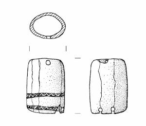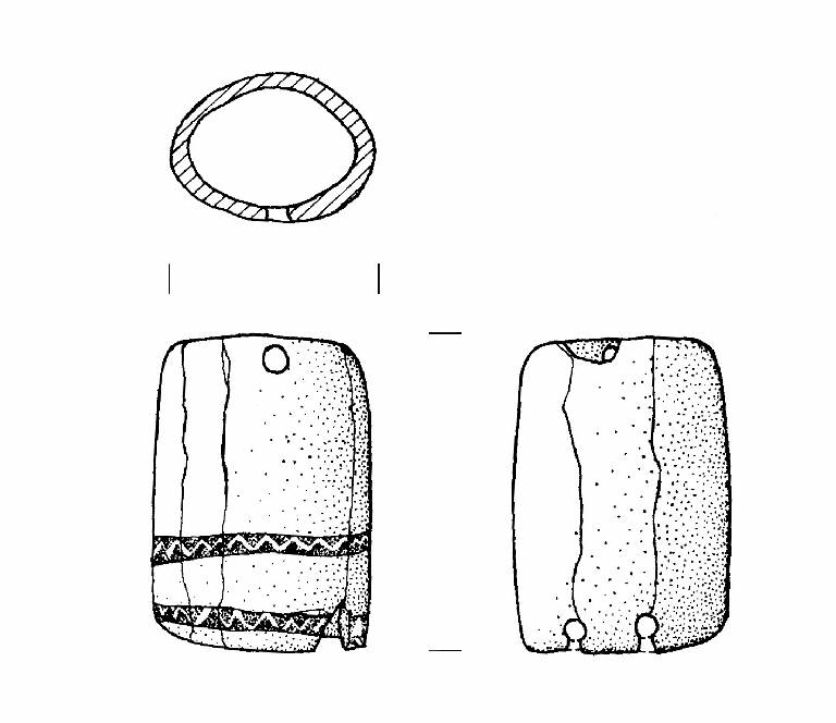 Corpo cilindrico a base ellittica. Tre fori passanti, di cui uno frontale in corrispondenza di un margine, due sul retro, in corrispondenza dell'altro margine. Decorazione costituita da due bande sub-parallele delimitate da due linee incise campite da una fila di triangoli contrapposti ad intaglio.