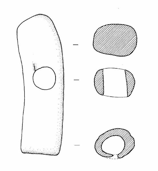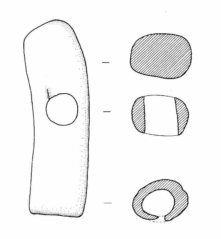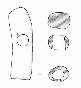 Forma cilindrica. Estremità prossimale convessa. Foro passante circolare a circa metà della lunghezza. Estremità distale cava con foro circolare.