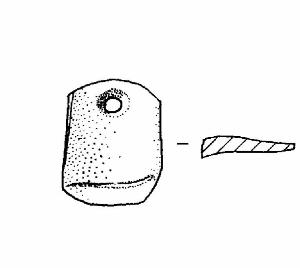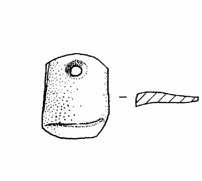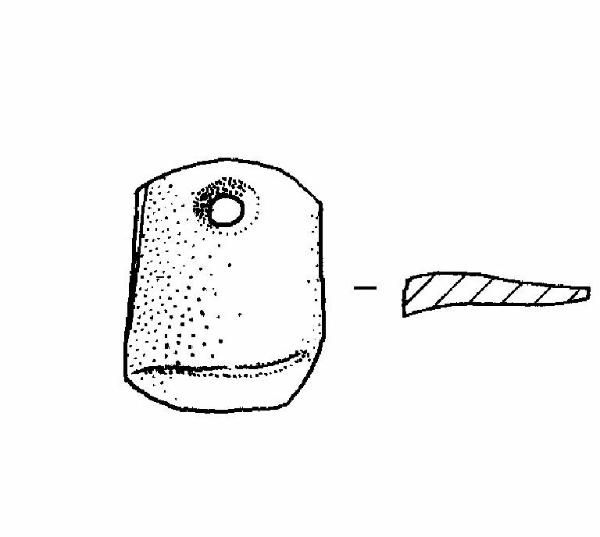 Forma rettangolare ad angoli smussati con foro passante del tipo a "clessidra" in corrispondenza di uno dei lati corti.