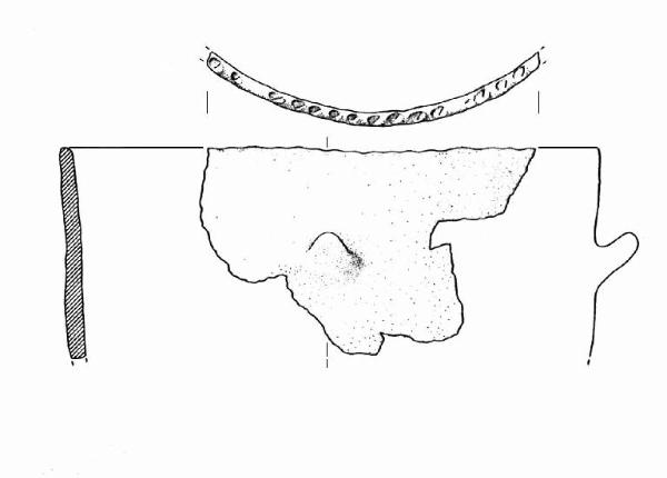 Orlo arrotondato con impressioni di polpastrello, parete rettilinea sulla quale è impostata una presa a linguetta triangolare obliqua verso l'alto. Colore: bruno.