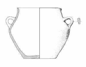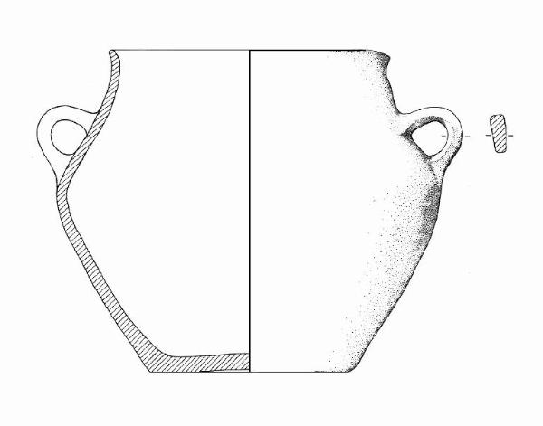 Orlo arrotondato, labbro estroflesso, corpo biconico, base leggermente concava. Ansa nastriforme ad anello impostata al di sopra del diametro massimo. Colore: nero.