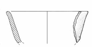 Orlo arrotondato lievemente stroflesso; parete distinta svasata rettilinea; carena a spigolo smussato. Colore: grigio scuro.
