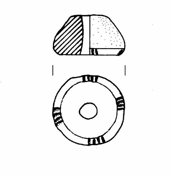 Base decorata da gruppi di quattro brevi solcature. Colore: marrone scuro.