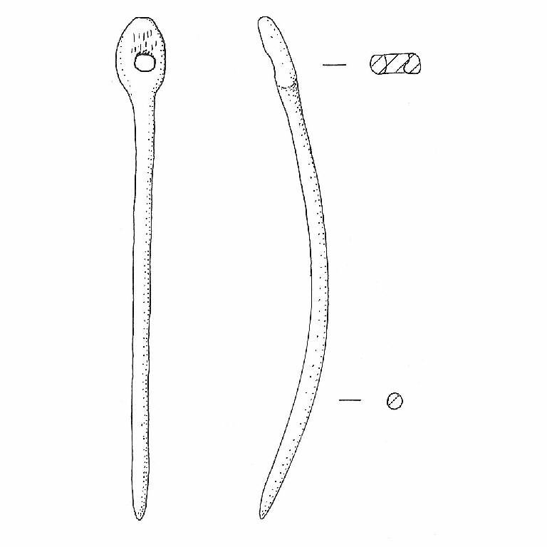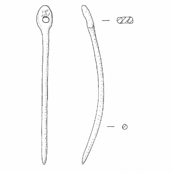 Capocchia di forma ovaleggiante con foro passante di tipo cilindrico. Gambo a sezione circolare.