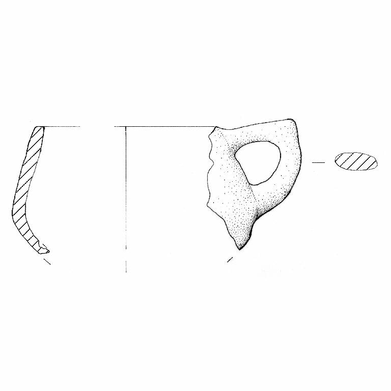 Orlo piatto; corpo biconico; ansa nastriforme a gomito con braccio superiore rettilineo impostato all'orlo. Colore:marrone molto chiaro.