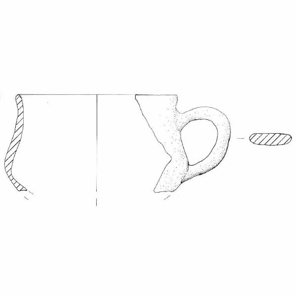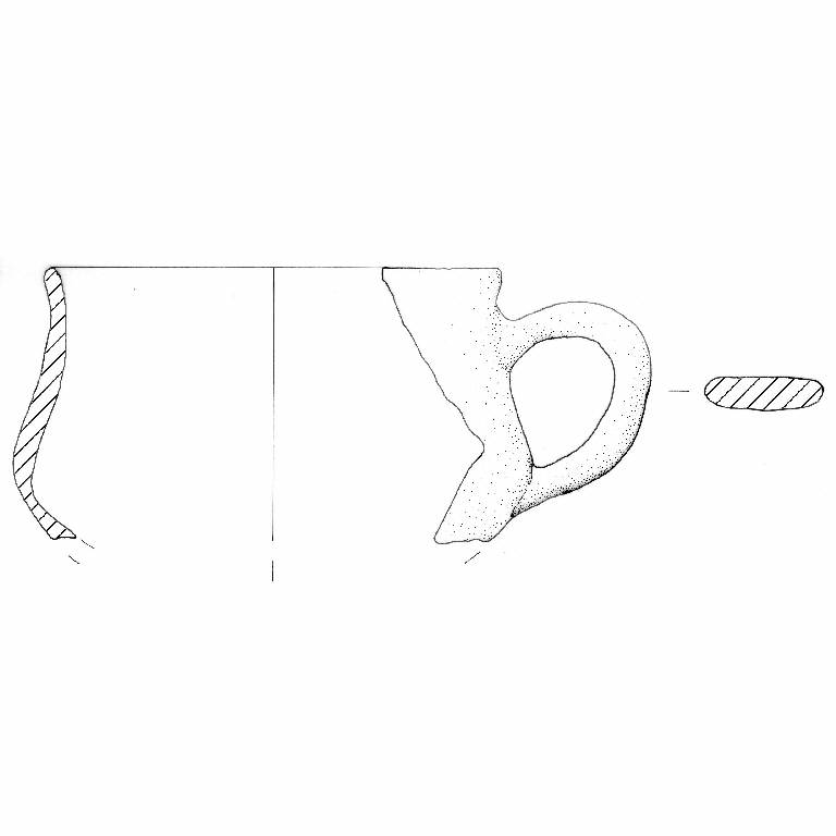 Orlo arrotondato; corpo articolato, ansa nastriforme ad orecchio impostata poco sotto l'orlo. Colore: grigio chiaro.