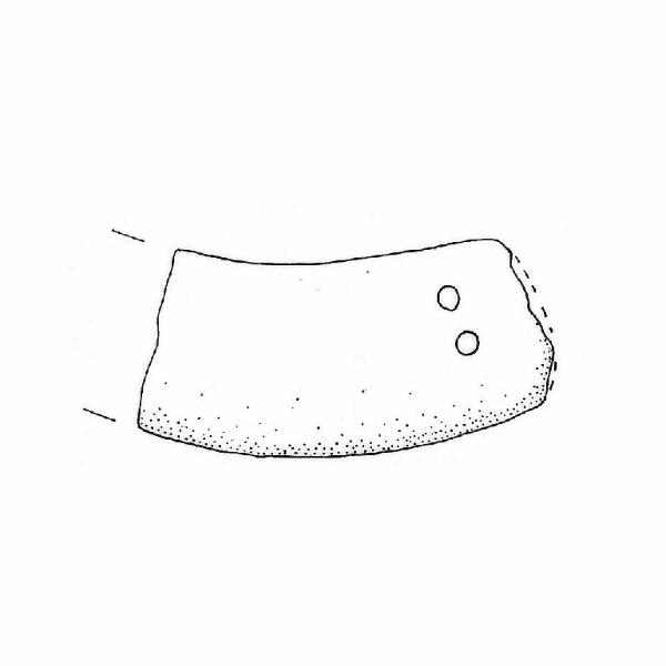 Forma semilunata a quattro fori passanti (se ne conservano due) di tipo cilindrico in corrispondenza dei lati corti.