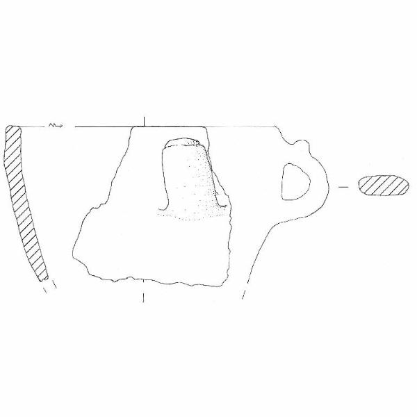 Orlo piatto; parete con andamento sub-rettilineo; ansa nastriforme ad abello con sopraelevazione a linguetta. Colore: grigio.