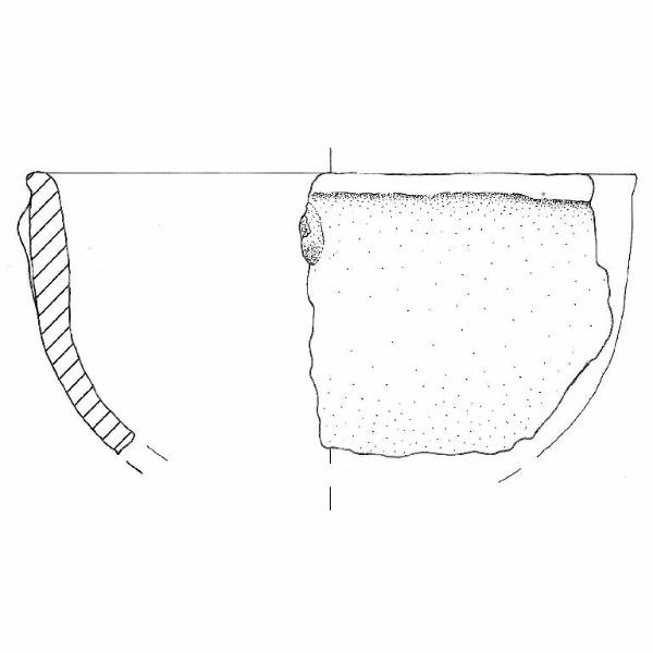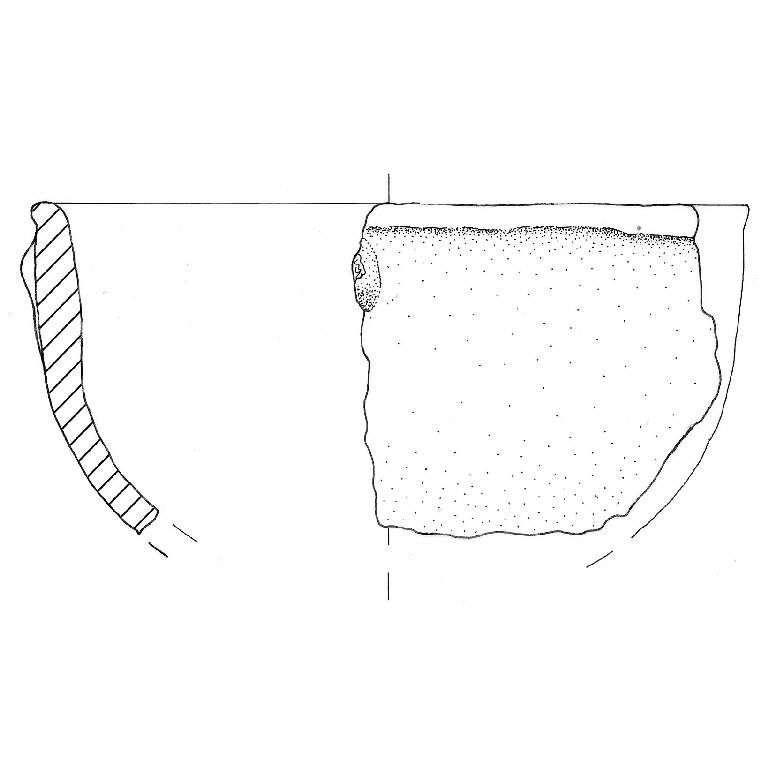 Orlo di forma arrotondata leggermente esoverso. Bugnetta di forma ovale poco sotto l'orlo. Colore:grigio molto scuro.