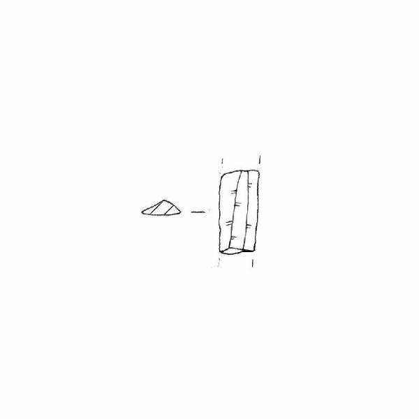 Lama a sezione trapezoidale. Presenta sui margini microfratture probabilmente postdeposizionali. Superficie lucida con frequenti inclusi biancastri. Colore grigio 5Y6/1.