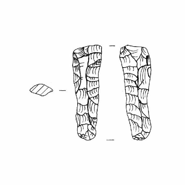 Grattatoio foliato multiplo. Ritocco, piatto coprente bifacciale irregolare denticolato. Margini rettilinei divergenti, margine superiore più ampio e convesso, margine inferiore fortemmenetente convesso, base arrotondata. Superficie opaca. Colore grigio molto scuro 2,5Y3/0.