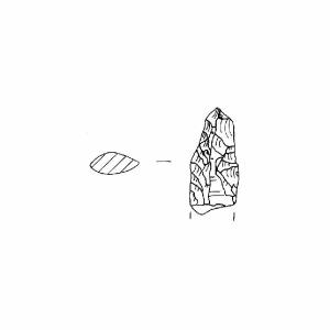 Punta foliata.Ritocco, piatto coprente bifacciale. Margini irregolari legg. Convessi. Sez. bombata. Superficie lucida. Colore grigio scuro 2,5Y4/0.