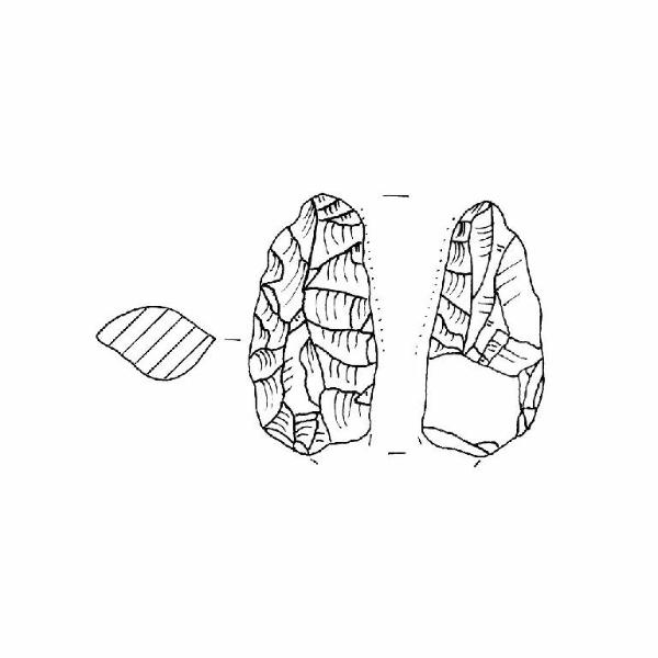 Raschiatoio foliato multiplo. Ritocco piatto, coprente, bifacciale. Margini sinistro convesso destro rettilineo, lato superiore arrotondato. Sezione bombata. Superficie lucida, tracce di gloss sul margine sinistro. Colore grigio 2,5Y5/0.