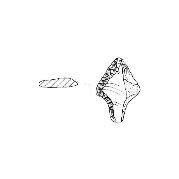 Punta foliata con peduncolo. Ritocco piatto, bifacciale, più regolare sul maregine sinistro. Margini rettilinei segolari, punta triangolare arrotondata, spalle accennate. Convergenti all'alto, peduncolo a margini convessii e base arrotondata . Sezione a. superficie opaca non vetrosa con tracce di cortice. Colore grigio scuro 7,5YR4/0.
