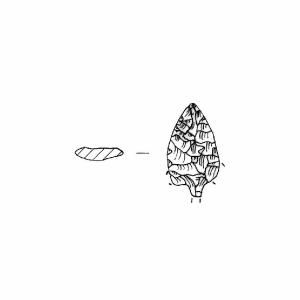 Punta foliata con peduncolo. Ritocco piatto, coprente bifacciale. Margini convessi, punta arrotondata, spalle convergenti al alto, peduncolo assottigliato a margini paralleli. Sezione piano-convessa. Superficie opaca. Colore grigio 7,5YR6/0.