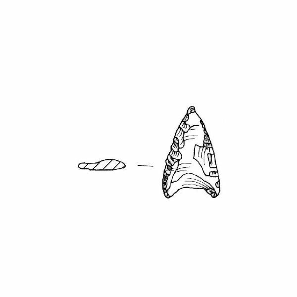 Punta foliata a base concava. Ritocco piatto, coprente, bifacciale. Margini convessi, alette accennate, punta triangolare. Sezione appiattita irregolare. Superficie lucida, incrostazioni calcaree sulla superficie. Colore grigio 5Y5/1.
