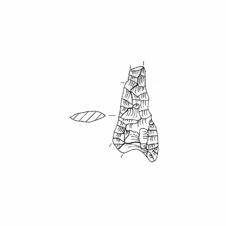 Punta foliata a base concava. Ritocco piatto, coprente, bifacciale. Margini leggermente concavi, ingrossata all'attacco delle alette. Sezione convessa. Superficie lucida. Colore oliva pallido 5Y6/4.