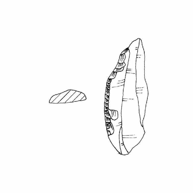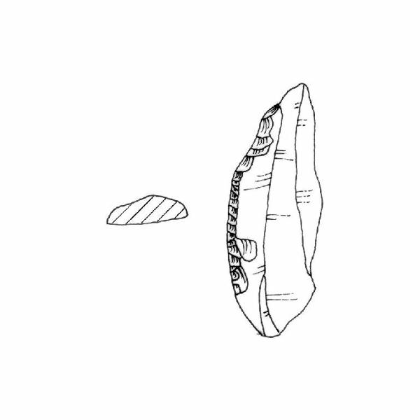 Punta su lama ritocco, piatto, marginale diretto sulla porzione superiore del margine sinistro e inverso sulla porzione distale del margine destro. Sezione piano-convessa. Superficie lucida. Colore grigio 7,5YR5/0.