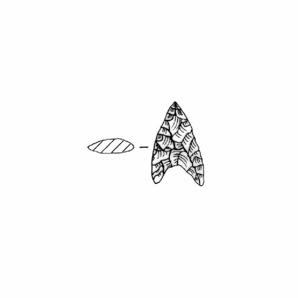 Punta foliata a base concava. Ritocco piatto, coprente, bifacciale, regolare. Margini convessi, alette convergenti. Sezione convessa. Superficie lucida. Colore oliva 5Y5/4.