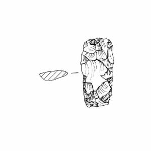 Grattatoio foliato ritocco piatto, coprente, bifacciale. Margini rettilinei convergenti al basso, margine superiore legg. Arrotondato margine inferiore piano. Sezione convessa. Superficie lucida. Colore bruno scuro 7,5YR4/2.