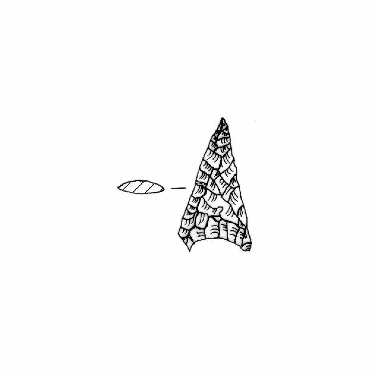 Punta foliata a base concava. Ritocco piatto, coprente, bifacciale, regolare. Margini rettilinei, alette convergenti. Sezione convessa. Superficie lucida. Colore oliva pallido 5Y673.